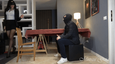 Mistress Gaia had left this guy in her house to do his inspections, as she felt the house had cameras and someone was spying on her. She needed this guy to conduct a thorough search, and he said it would take a while, so she had to leave for work and leave him in the house. In the evening, she came back and found him there, and when she inquired about the progress, he said he did not find anything, but the mistress was sure her instincts were right, so to punish him for wasting both their times, she made him worship her feet, then she gave him a foot job and asked him to leave high and dry